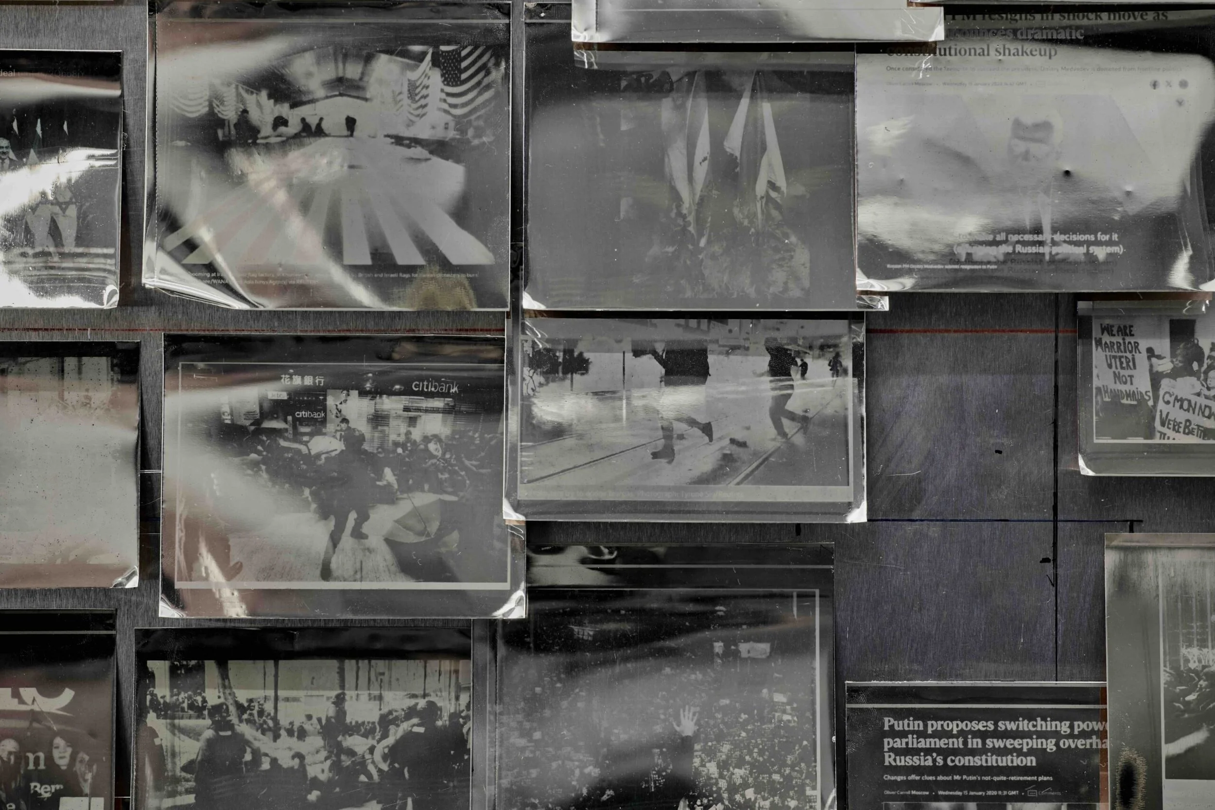 Employing the daguerreotype process, Young reproduced these screenshots as photographs on precious silver-coated copper plates, which are mounted, as if to resemble a wall of sorrow or a Google Images screen filled with news headlines. Reflecting the viewer in the shiny surface of one year’s history, these ubiquitous yet fleeting photographs of world events and their associated memories are recalled in an almost atemporal space, where time exists in a distinct disjunction between before, during, and after. While Young’s work fixes these images in time, the experience of encountering these traces of global disasters, banal news, and pop culture evokes a sense of belatedness and perpetual return. Claire Bishop has identified the contemporary photographic condition of spectatorship, characterised by documenting the world at the same time as we look, engage, and respond—referring to it as “reflex documentation.”[2] Yet, such fleeting engagement with world events or banal news items is soon relegated to the past, to history, returning to our screens periodically through social media ‘memory’ algorithms.